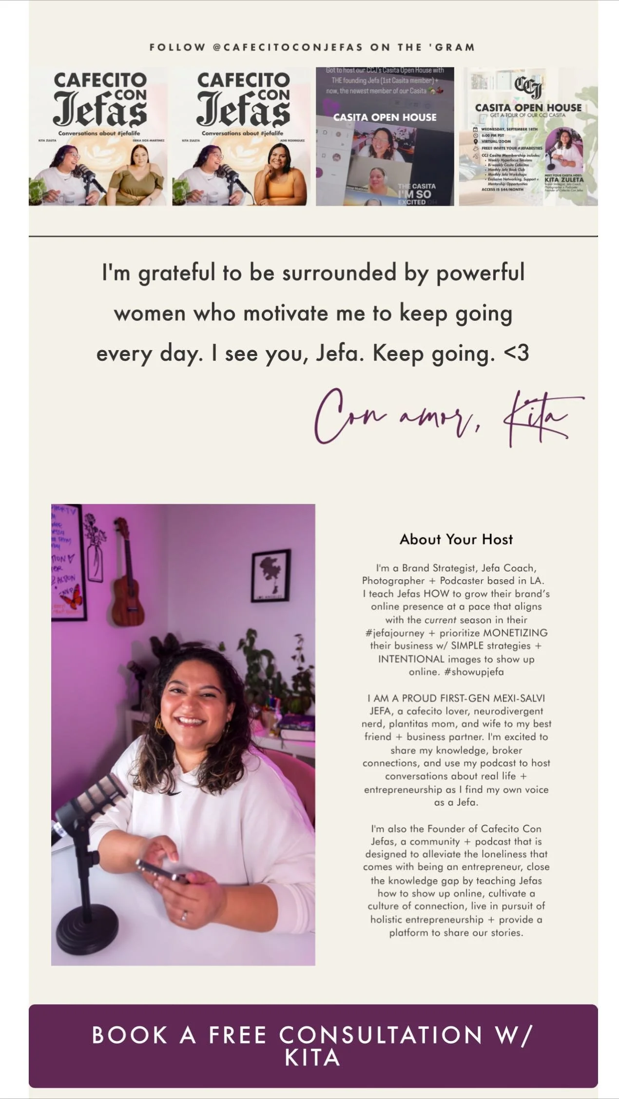 "Cafecito Con Jefas Podcast os a warm, empowering heaven for entreprenuerial women, Kita Zuleta’s inspiring storied, brand strategies, and shared experiences create a community that’s ‘Same. Same, but different.’ It’s a cup of wisdom, camaradarie, and motivation in every episode." - Fer